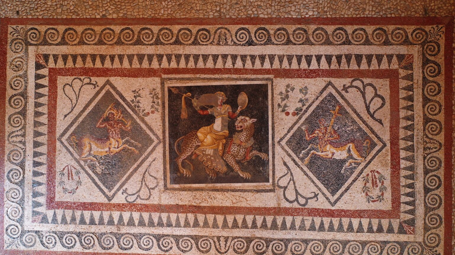 Εξίσου εντυπωσιακές είναι οι ιδιωτικές κατοικίες στη συνοικία του Θεάτρου, οι οποίες πήραν τα ονόματά τους από τα θαυμάσια ψηφιδωτά που κοσμούν τα δάπεδά τους. Όπως η κάποτε διώροφη, υπερπολυτελής Οικία του Διονύσου, το ισόγειο της οποίας στολίζει ψηφιδωτό που απεικονίζει τον θεό Διόνυσο με ανοιχτά φτερά, να ιππεύει μια τίγρη με στεφάνι από σταφύλια στο λαιμό της. Θαυμάζοντας τις υπέροχες λεπτομέρειες και τα ζωντανά ακόμα χρώματα της παράστασης, δεν είναι δύσκολο να κλείσει κανείς για λίγο τα μάτια και να φανταστεί τους πλούσιους ενοίκους να υποδέχονται τους επιφανείς επισκέπτες τους με μια κούπα εκλεκτό κρασί. Το ίδιο το θέατρο που χάρισε το όνομά του στη συνοικία μπορούσε να φιλοξενήσει περίπου 5.500 θεατές, προσφέροντάς τους μαζί με την εκάστοτε παράσταση μια μοναδική θέα στο Αιγαίο Πέλαγος.