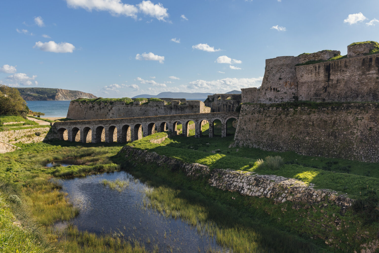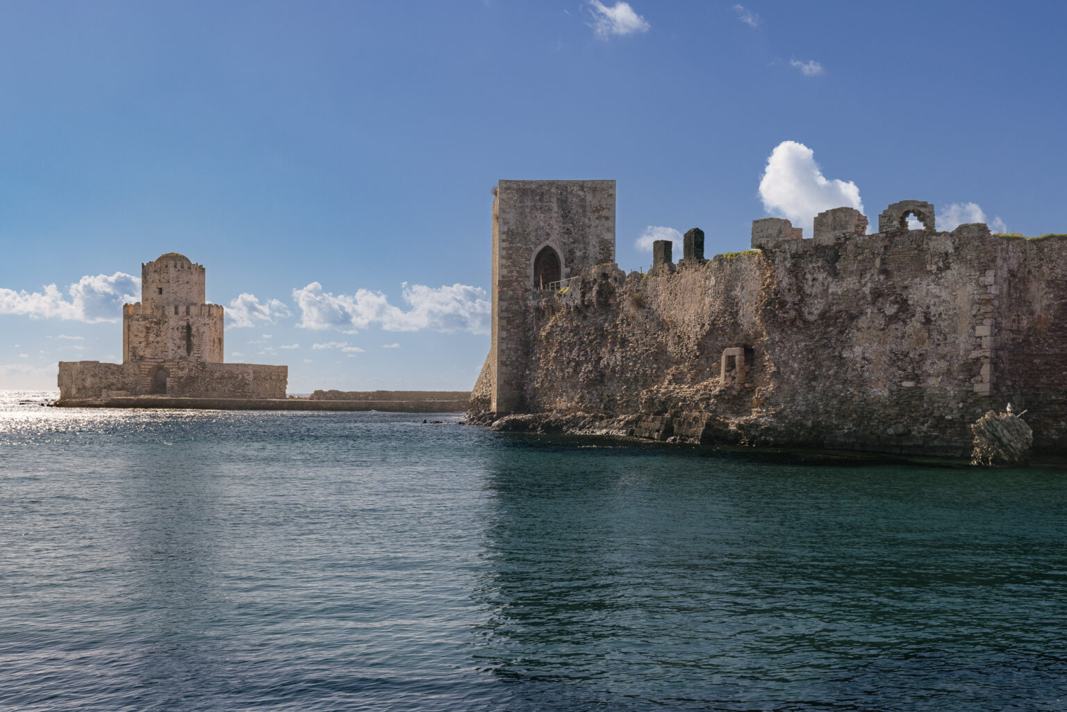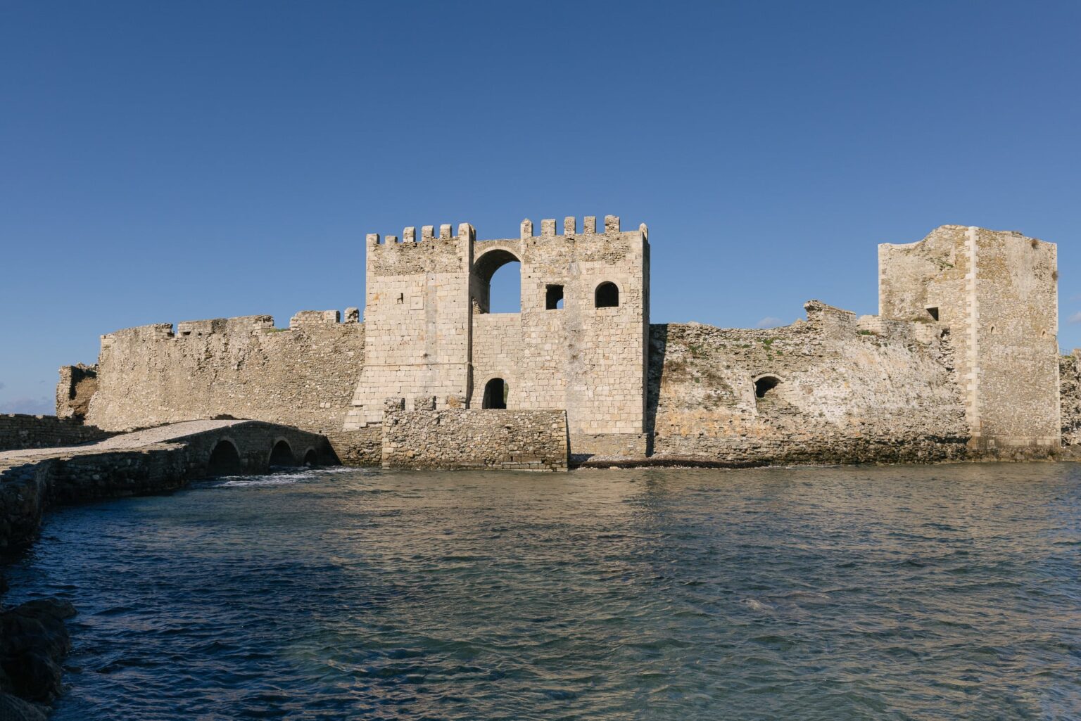 Κανένα από τα 93 στρέμματα της χερσονήσου δεν έμεινε ανεκμετάλλευτο. Στο σημείο όπου συναντάει τη μεσσηνιακή στεριά, οι Ενετοί –στους οποίους οφείλονται οι μεσαιωνικές οχυρώσεις που βλέπουμε σήμερα– έσκαψαν μια εντυπωσιακή άνυδρη τάφρο, όπου ο μοναδικός τρόπος να προσεγγίσεις την κεντρική χερσαία πύλη είναι να διασχίσεις μια πέτρινη γέφυρα με 14 καμάρες.
