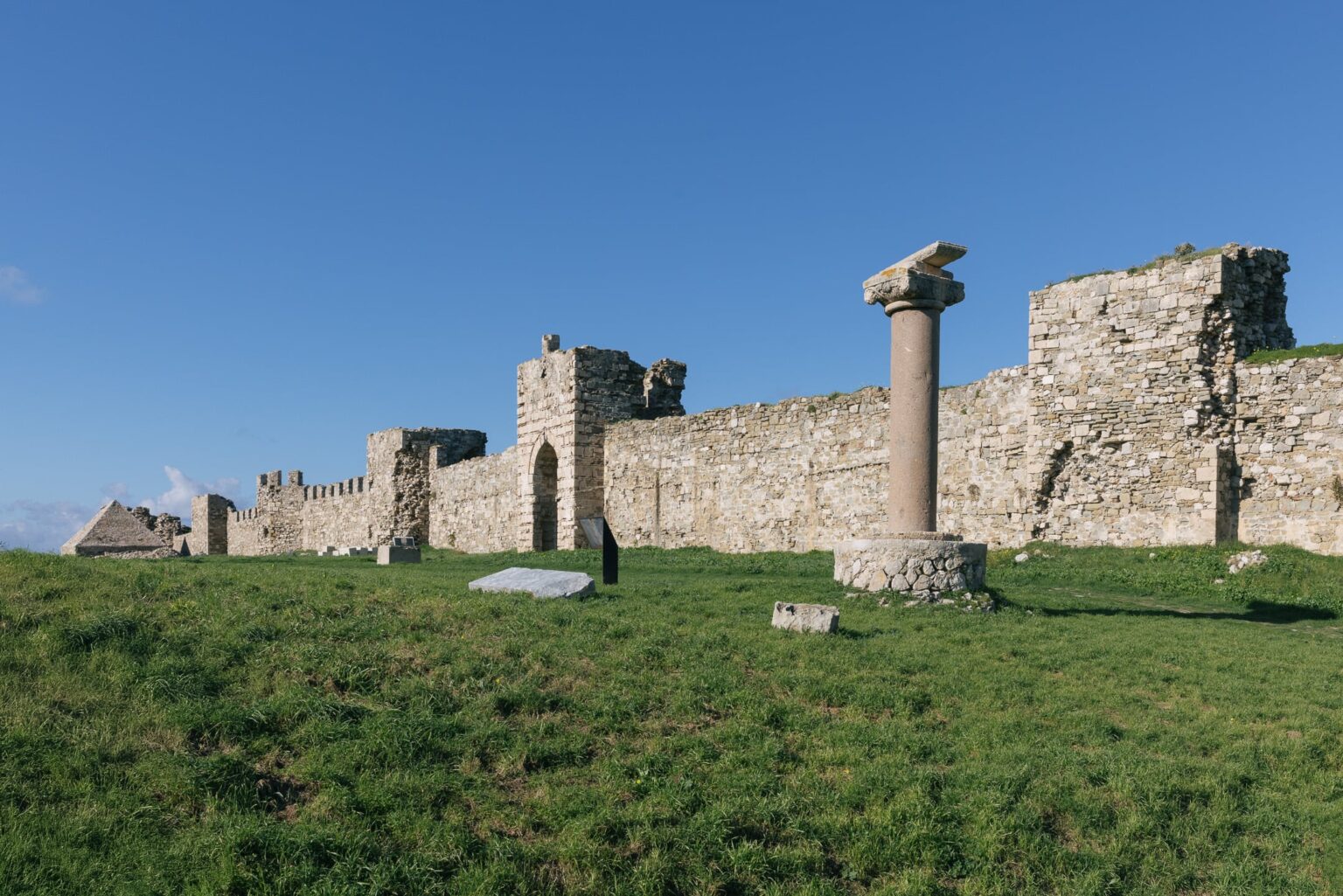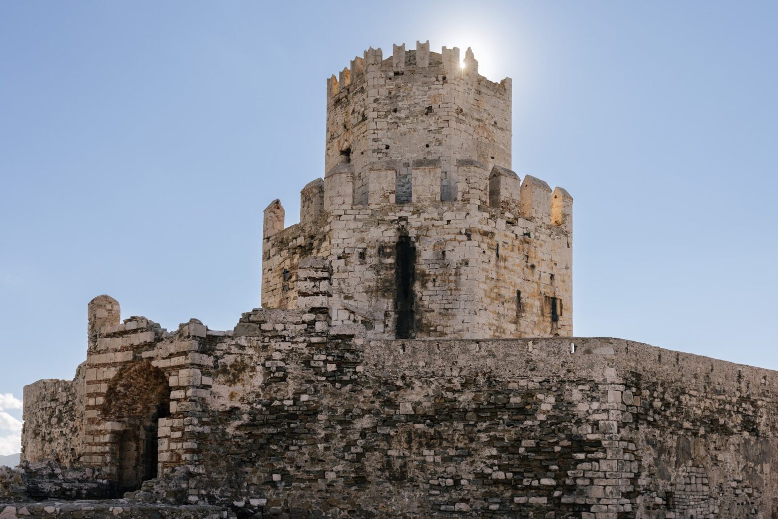 Το Κάστρο της Μεθώνης καταλαμβάνει ολόκληρη τη χερσόνησο του Αγίου Νικολάου, με τις οχυρώσεις να φτάνουν σύρριζα στη θάλασσα που το περιτριγυρίζει.