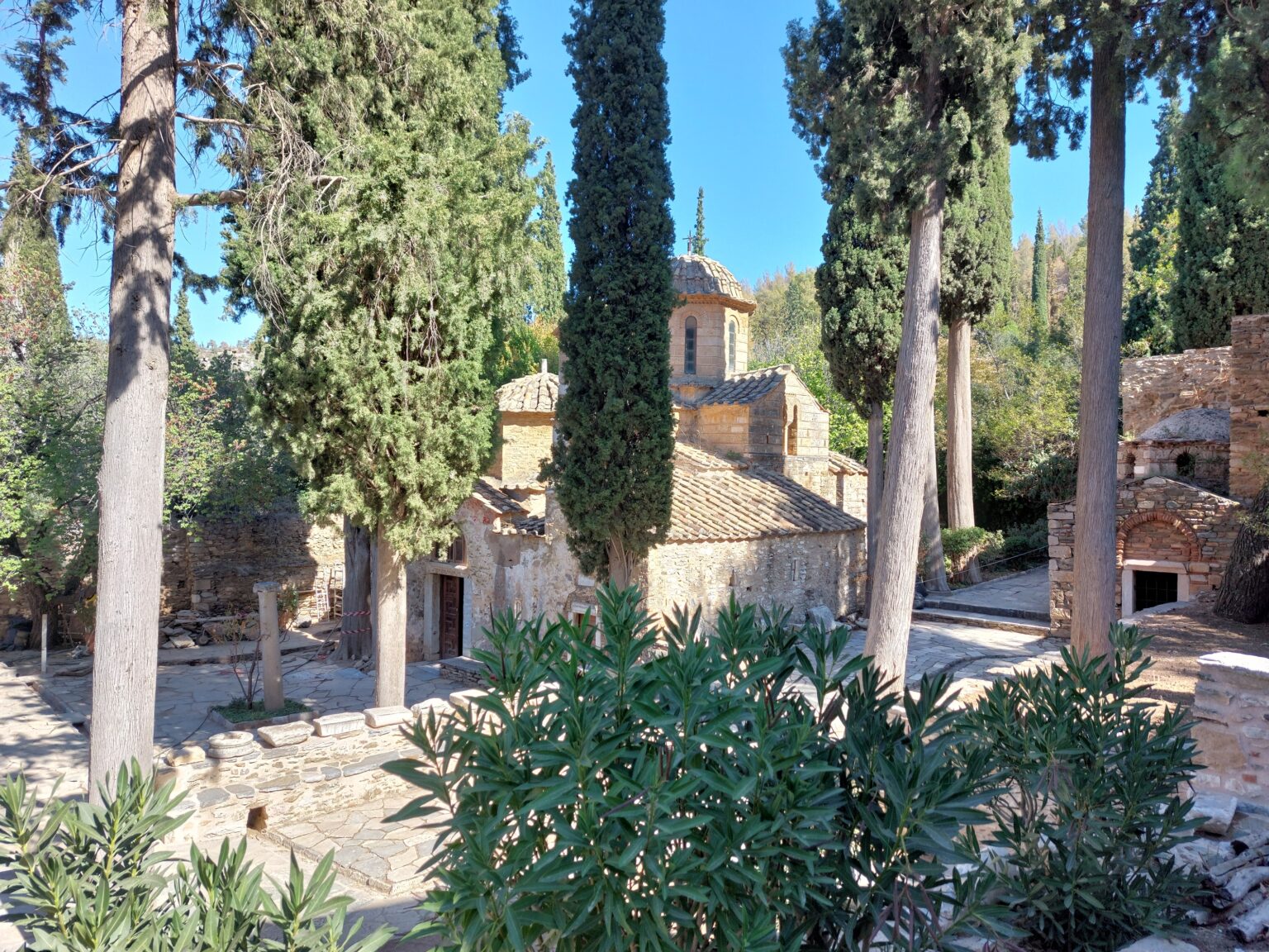 Μέσα στον οχυρωματικό περίβολο της Μονής των Εισοδίων, τα κτίσματα διηγούνται τη μακραίωνη ιστορία της. Ο ναός (καθολικό) και ο λουτρώνας – από την εποχή της ίδρυσής της, η τράπεζα, οι αποθήκες και τα κελιά των μοναχών, αναπτύσσονται σε διάφορα επίπεδα γύρω από την ειδυλλιακή αυλή της. Εντυπωσιακός είναι ο «Πύργος των Μπενιζέλων», της αρχοντικής αθηναϊκής οικογένειας που χρηματοδότησε το 1682 τις τοιχογραφίες στο νάρθηκα που προστέθηκε στο καθολικό.