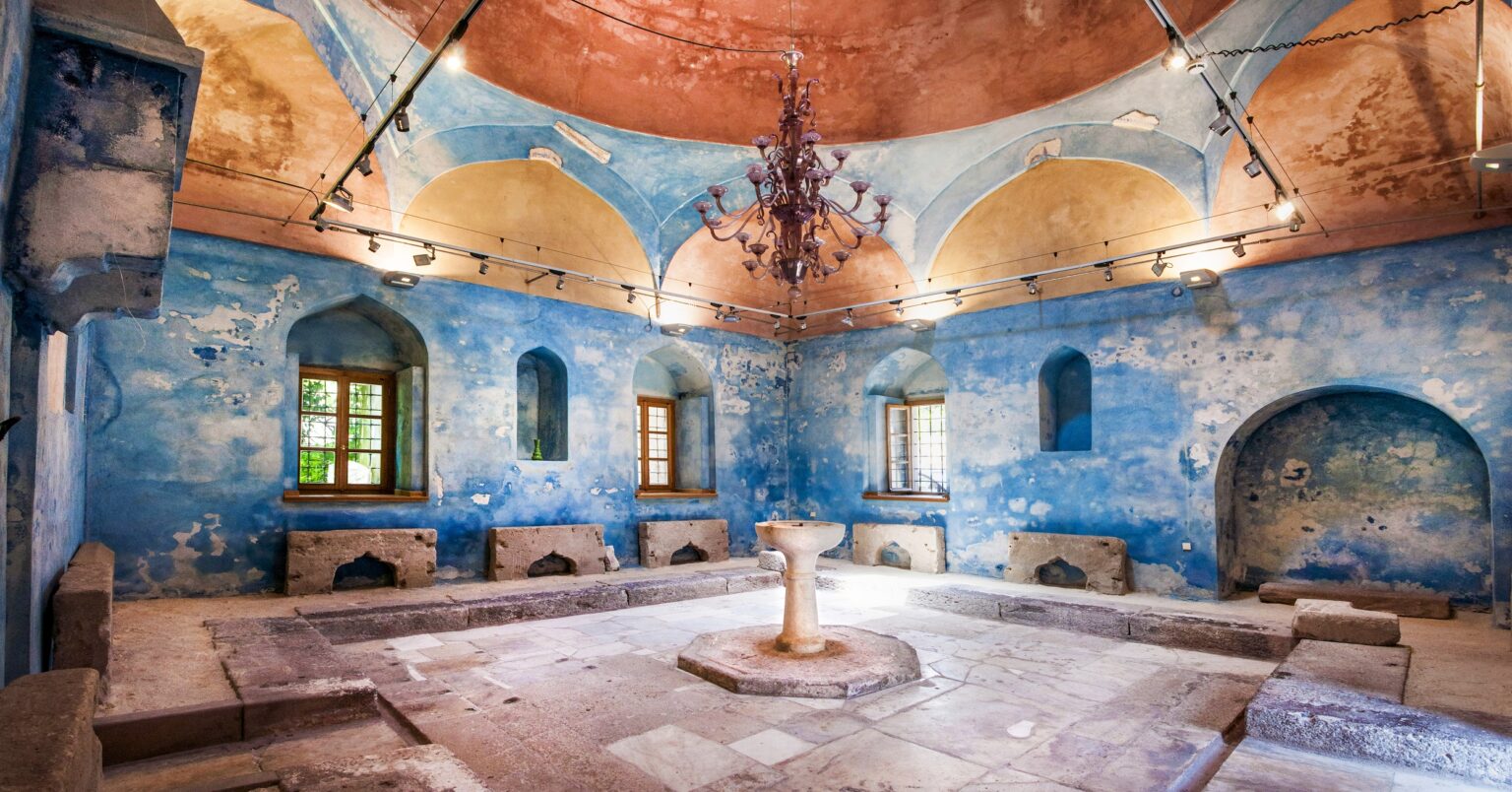 Στα πρότυπα των βυζαντινών και οθωμανικών λουτρών, ακολουθούσε γραμμική διάταξη, όπου ο επισκέπτης περνούσε σταδιακά από το ψυχρό στο θερμό στοιχείο.